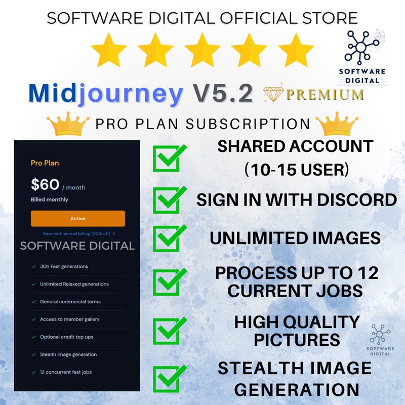 ?Only one device per login, only can access on PC / Laptop / Mac / iPad *We are using QRCODE simple login method for discord to access midjourney ! *It is a sharing account and will be using seller discord ! *Each User will have own private user channel ! * Free PS AI BETA 2023 for purchase 3 Months Plan and above! ??? ?????? ????? ?????????? ?????, ?????? ????? [??? ????] !!! ? ?????????? ???????? ???? ? 15 hours/month of Fast GPU Time* ? Unlimited Relaxed Mode GPU TIME (v5.1) ? Access to the exclusive member gallery ? Capacity for 3 concurrent jobs, and a queue of 10 jobs* ? Priority access to new features and improvements ⚡ ?????????? ??? ???? + ? 30 hours/month of Fast GPU Time* ? Stealth Mode exclusively for Pro users ? Unlimited Relaxed Mode GPU TIME (v5.1) ? Access to the member gallery ? Ability to run 12 concurrent Fast Jobs, 3 concurrent Relaxed Jobs, and a queue of 10 jobs* ? Priority access to new features and improvements * Fast hours are based on FCFS, and some functions may limit! ? OUR PROMISE TO YOU ? Swift delivery! ? Unbeatable prices! ? Outstanding after-sales service! ? Always ready to assist you via chat! ??? Midjourney: The AI Art Generator that Brings Your Ideas to Life! ? Generate beautiful, high-quality images from natural language prompts using Midjourney's powerful AI technology. ? With Midjourney, you don't need to be an artist to create stunning visuals. Simply type in your idea or description, and the bot will generate a set of four images for you to choose from. ? Midjourney is available as a Discord bot, making it easy to access and use from anywhere. Plus, it's currently in open beta, so you can try it out for free! ? Choose from a variety of themes and styles to create the perfect image for your project or idea. From landscapes and animals to abstract art and more, Midjourney has something for everyone. ? The Midjourney team is constantly working to improve and expand the capabilities of the AI, so you can expect even more amazing features in the future. ? Whether you're a designer, writer, marketer, or just someone with a creative vision, Midjourney is the perfect tool for bringing your ideas to life in stunning detail. Try it out today and see for yourself! ?? ?&?. ? No Refund & all sales final ? Backup your own artwork and data ? Don’t share your account with others ? Do not change the password and email ? Bugs and server down may still occur as it is still in a new stage ? Please note that the lifetime validity of the product subscription is subject to either the end-of-business on the agreed-upon date or any changes to Midjourney subscription policy. ??? ? Shared Account? Absolutely! ? ? Need instructions? Our comprehensive guide is here to help! ?? ? Must I use the seller-provided account? Yes, indeed! ? To obtain this product, follow these steps: ✅ Complete payment via Shopee. ✅ Message us. ✅ Follow instructions provided for login.