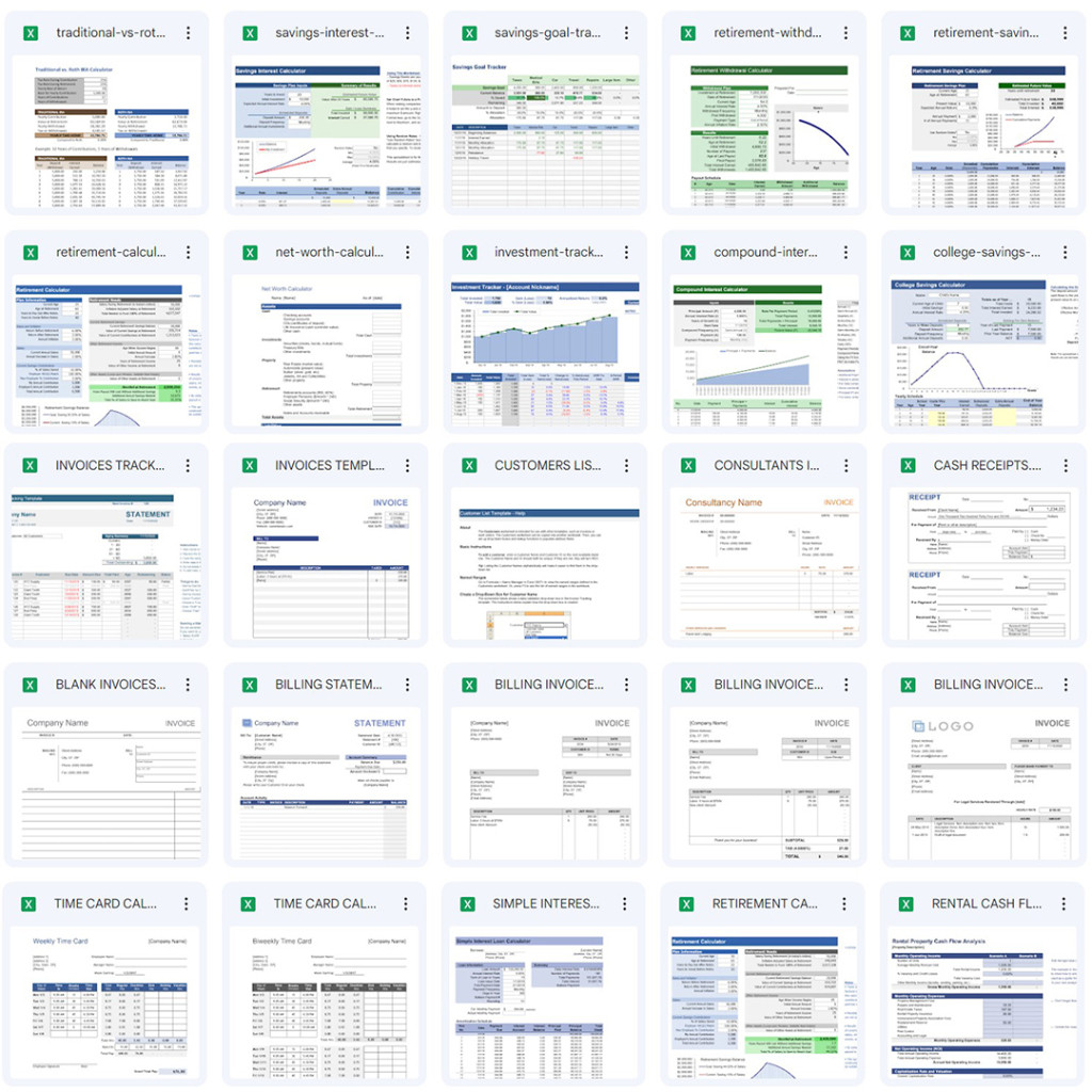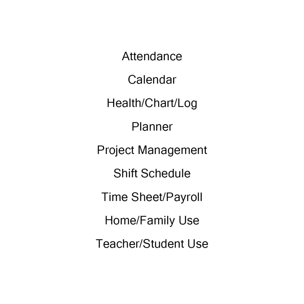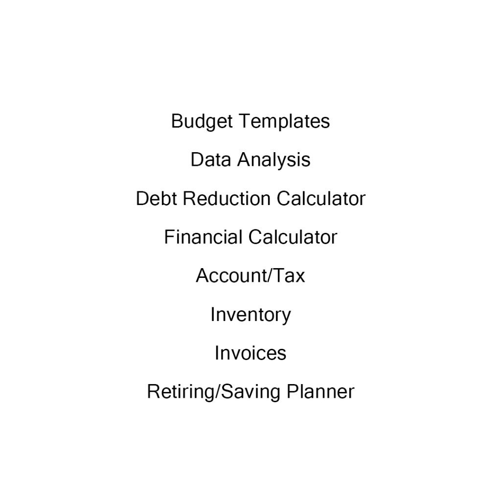 436 IN TOTAL MICROSOFT EXCEL TEMPLATES - Budget Templates - Data Analysis - Debt Reduction Calculator - Financial Calculator - Account/Tax - Inventory - Invoices - Retiring/Saving Planner - Attendance - Calendar - Health/Chart/Log - Planner - Project Management - Shift Schedule - Time Sheet/Payroll - Home/Family Use - Teacher/Student Use This product will be sent via email. No physical item will be shipped.