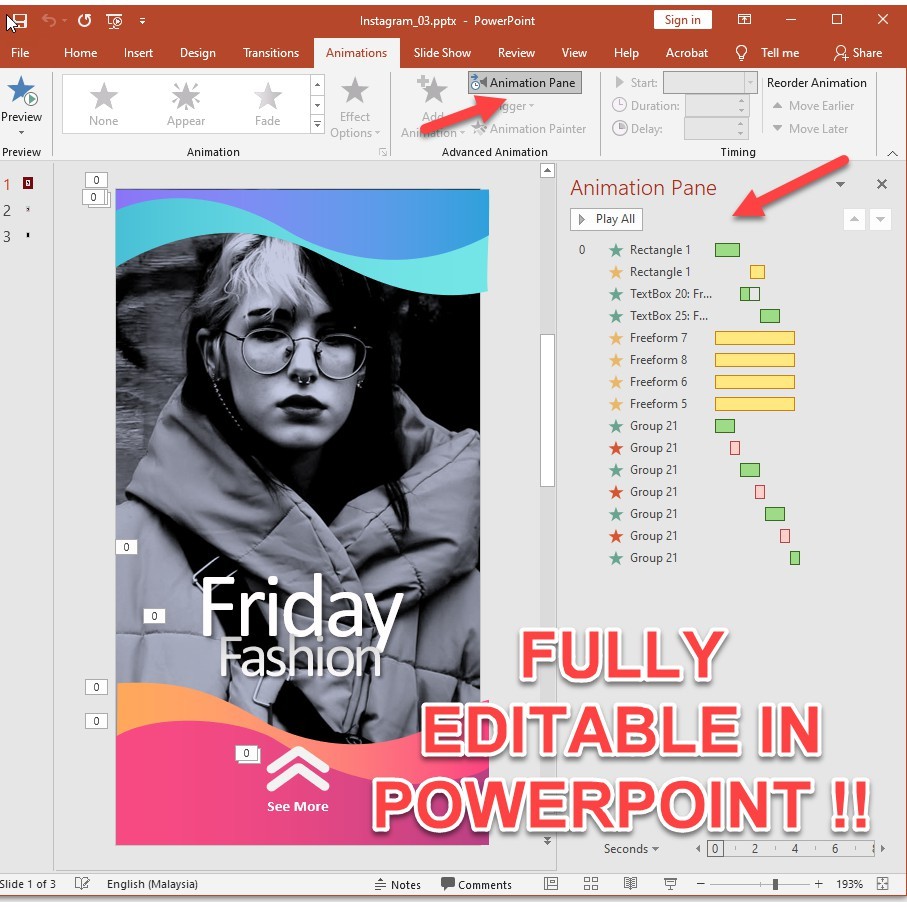 ❗❗❗❗ What’s inside this Bundle ❗❗❗❗ ✅ 100 Premium Video Template ✅ Square and Landscape format ✅ 100 Flash Transition Backgrounds ✅ 300 background music for video template ✅ Fonts ❗❗❗❗ Who Should Buy This? ❗❗❗❗ ? If you want to create cool stories but you still confused where to start, so you must try this one. ? You doesn’t need to have design skill. ? All you need only computer with Ms PowerPoint inside. ? and you can customize easily with 3 simple step (choice – edit – done) ? Not only video templates, we also give you static design templates and typography design. So, you can create different combinations by your self ? File Size : 5.7GB ? Real Value : RM200 ❗❗❗❗ Categories covered ❗❗❗❗ Education Sales Promotional Event Fashion Food Party Personal Branding Real Estate Typography