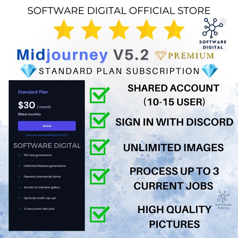 ?Only one device per login, only can access on PC / Laptop / Mac / iPad *We are using QRCODE simple login method for discord to access midjourney ! *It is a sharing account and will be using seller discord ! *Each User will have own private user channel ! * Free PS AI BETA 2023 for purchase 3 Months Plan and above! ??? ?????? ????? ?????????? ?????, ?????? ????? [??? ????] !!! ? ?????????? ???????? ???? ? 15 hours/month of Fast GPU Time* ? Unlimited Relaxed Mode GPU TIME (v5.1) ? Access to the exclusive member gallery ? Capacity for 3 concurrent jobs, and a queue of 10 jobs* ? Priority access to new features and improvements ⚡ ?????????? ??? ???? + ? 30 hours/month of Fast GPU Time* ? Stealth Mode exclusively for Pro users ? Unlimited Relaxed Mode GPU TIME (v5.1) ? Access to the member gallery ? Ability to run 12 concurrent Fast Jobs, 3 concurrent Relaxed Jobs, and a queue of 10 jobs* ? Priority access to new features and improvements * Fast hours are based on FCFS, and some functions may limit! ? OUR PROMISE TO YOU ? Swift delivery! ? Unbeatable prices! ? Outstanding after-sales service! ? Always ready to assist you via chat! ??? Midjourney: The AI Art Generator that Brings Your Ideas to Life! ? Generate beautiful, high-quality images from natural language prompts using Midjourney's powerful AI technology. ? With Midjourney, you don't need to be an artist to create stunning visuals. Simply type in your idea or description, and the bot will generate a set of four images for you to choose from. ? Midjourney is available as a Discord bot, making it easy to access and use from anywhere. Plus, it's currently in open beta, so you can try it out for free! ? Choose from a variety of themes and styles to create the perfect image for your project or idea. From landscapes and animals to abstract art and more, Midjourney has something for everyone. ? The Midjourney team is constantly working to improve and expand the capabilities of the AI, so you can expect even more amazing features in the future. ? Whether you're a designer, writer, marketer, or just someone with a creative vision, Midjourney is the perfect tool for bringing your ideas to life in stunning detail. Try it out today and see for yourself! ?? ?&?. ? No Refund & all sales final ? Backup your own artwork and data ? Don’t share your account with others ? Do not change the password and email ? Bugs and server down may still occur as it is still in a new stage ? Please note that the lifetime validity of the product subscription is subject to either the end-of-business on the agreed-upon date or any changes to Midjourney subscription policy. ??? ? Shared Account? Absolutely! ? ? Need instructions? Our comprehensive guide is here to help! ?? ? Must I use the seller-provided account? Yes, indeed! ? To obtain this product, follow these steps: ✅ Complete payment via Shopee. ✅ Message us. ✅ Follow instructions provided for login.